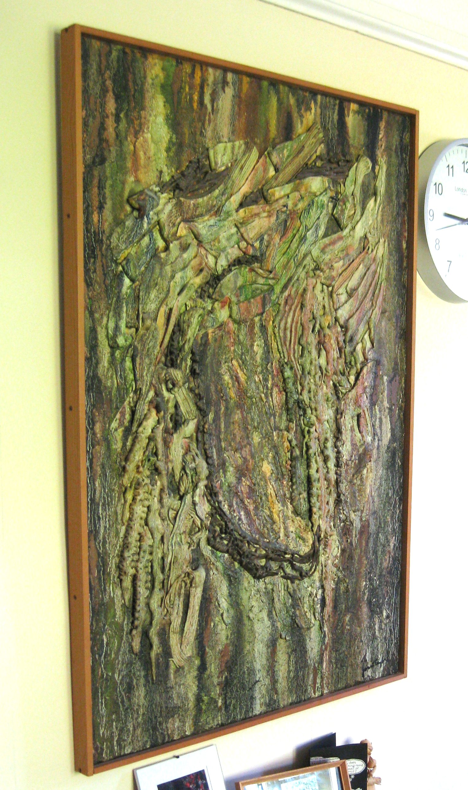 "Captures the movement caused by a breaking through of the materials of oil and plaster on canvas."